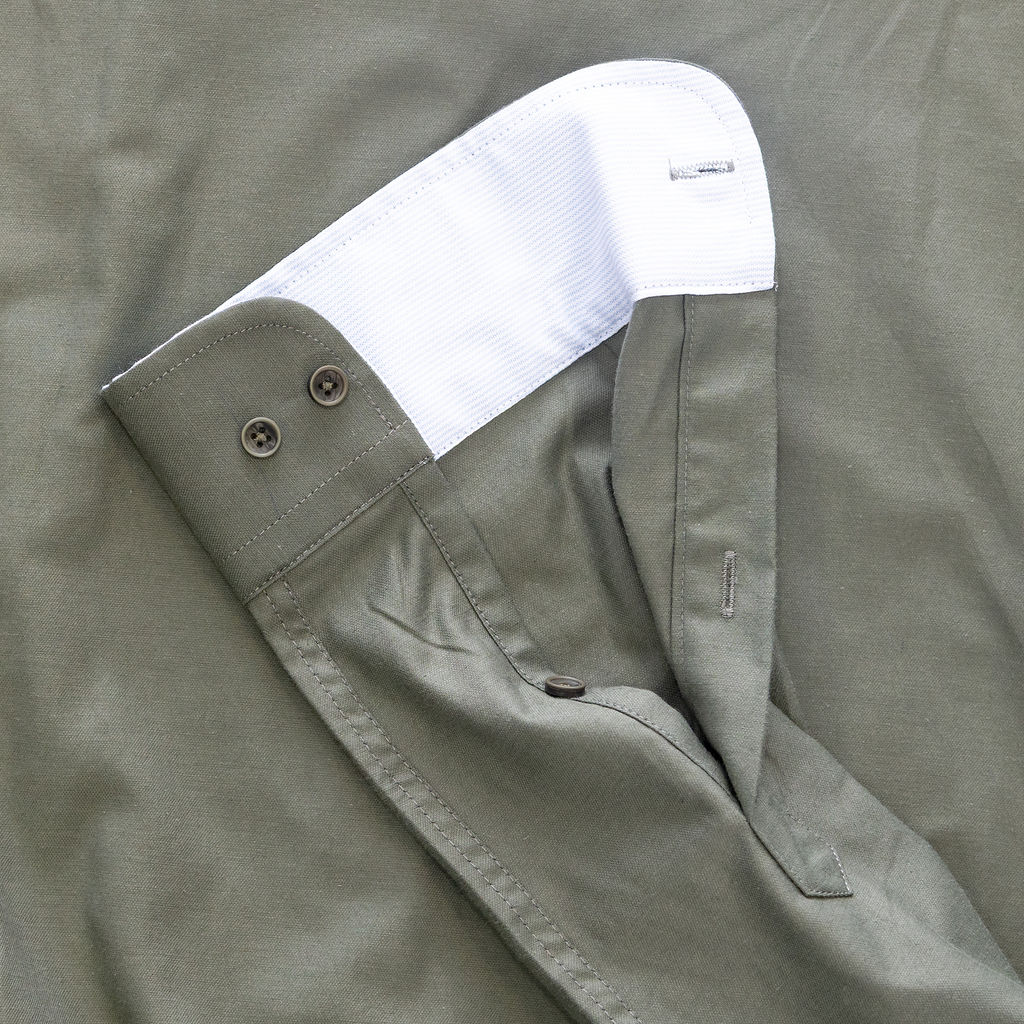 The inside collar and cuffs are lined with a striking white and blue stripe contrast fabric, adding a fresh detail when sleeves are rolled up or the top button is open, giving it a premium finish from the inside out.